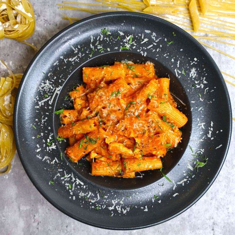 Am Ende alles mit Salz & optional frischer Pfeffer abschmecken und einem Stabmixer glatt pürieren. Für mehr Fruchtigkeit optional etwas Apfelmus unterrühren.Mit Pasta genießen.